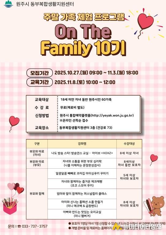 원주시 동부복합생활지원센터는 오는 11월 8일 주말 가족 프로그램 ‘온 더 패밀리(On The Family)’ 10기 과정을 운영한다.