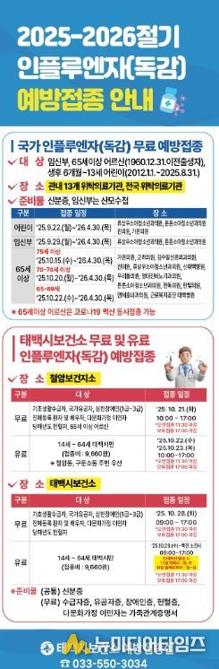 태백시는 시민들의 건강하고 안전한 겨울나기를 위해 2025년 인플루엔자(독감) 예방접종을 당초 11월 초에서 3주 앞당겨 10월 21일부터 실시한다고 밝혔다.