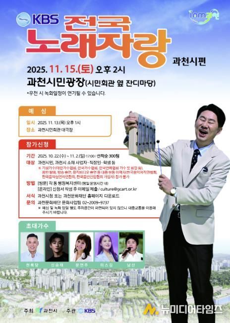 ‘전국노래자랑’은 남녀노소 누구나 참여할 수 있는 국민 참여형 음악 프로그램으로, 시민들의 끼와 재능을 한껏 뽐낼 수 있는 무대다. 이번 과천시 편은 개그맨 남희석의 사회로 진행되며, 천록담, 신승태, 문연주, 미스김, 남산 등 초대 가수들이 무대에 올라 흥겨운 공연을 선보일 예정이다.