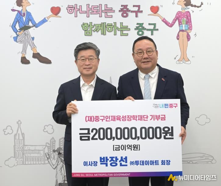 서울 중구는 ㈜투데이아트 박장선 회장이 서울중구인재육성장학재단에 지역 인재 육성을 위한 장학금 2억원을 기탁했다고 22일 밝혔다. 전달식은 지난 21일 중구청장실에서 열렸다.