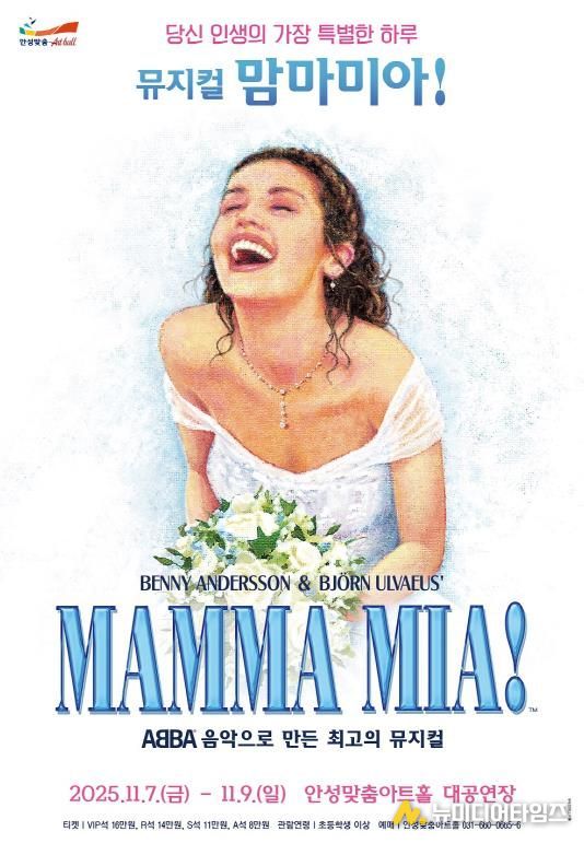 안성맞춤아트홀은 오는 11월 7일부터 9일까지 대공연장에서 세계적인 히트 뮤지컬 '맘마미아!'를 무대에 올린다. 세대를 초월한 명곡과 유쾌한 스토리로 사랑받아온 이번 작품은 남녀노소 누구나 즐길 수 있는 최고의 힐링 뮤지컬이다.