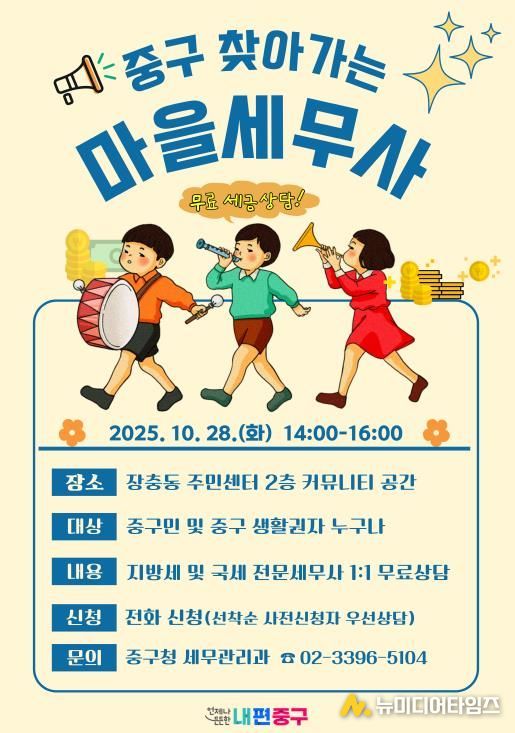 서울 중구가 오는 28일 장충동 주민센터에서 오후 2시부터 4시까지 '찾아가는 마을세무사'를 운영한다.