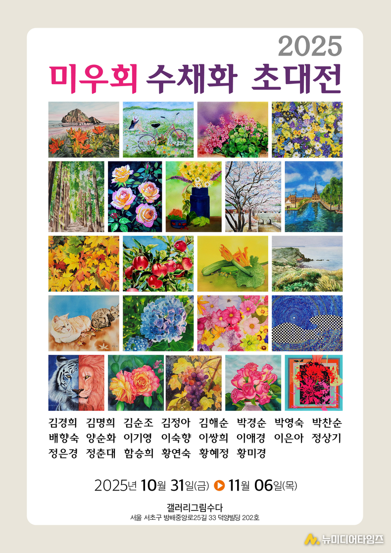 2025년 10월 31일부터 11월 6일까지 서울 서초구 방배동 갤러리 그림수다에서 열리는 "2025 미우회 수채화 초대전" 은 ‘일상의 색, 마음의 온도’를 주제로 한 다채로운 수채화 작품들을 선보인다.