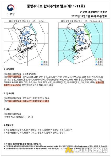 이번 한파주의보는 서울 동북권(도봉구‧노원구‧강북구‧성북구‧동대문구‧중랑구‧성동구‧광진구)과 서남권(강서구‧양천구‧구로구‧영등포구‧동작구‧관악구‧금천구) 15개 자치구에 발효된다.