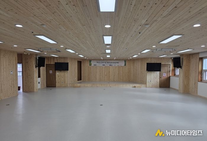 그동안 노후화된 벽면과 천장, 바닥으로 인해 이용자 불편이 제기됐던 대강당은 이번 공사에서 국산 친환경 목재를 중심으로 내부 마감과 시설 안전성을 개선했다. 목재 마감은 시각적 쾌적성뿐 아니라 실내 공기질 개선과 정서적 안정에도 긍정적 영향을 주는 것으로 알려져 있어, 지역 어르신들의 이용 만족도 향상과 건강 증진에 기여할 것으로 기대된다.