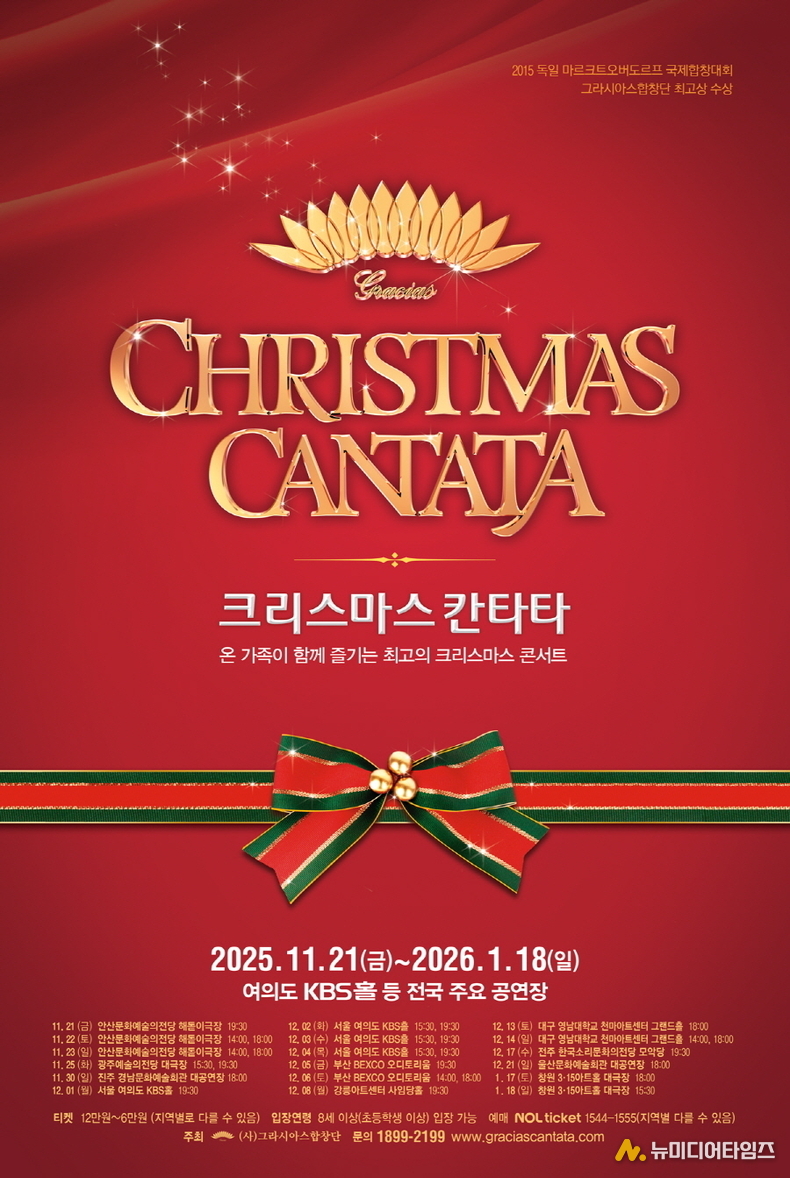 창단 25주년을 맞은 그라시아스합창단이 올겨울 '크리스마스 칸타타' 전국 투어 공연을 개최한다. 오는 21일 안산문화예술의전당을 시작으로 내년 1월까지 안산, 광주, 진주, 서울, 부산, 강릉, 대구, 전주, 울산, 창원 등 전국 10개 도시에서 총 27회에 걸쳐 진행되는 이번 공연은 크리스마스의 진정한 의미를 오페라, 뮤지컬, 합창 등 다채로운 형식으로 선보인다.
