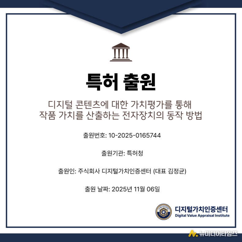 ㈜디지털가치인증센터(대표 김정균)는 디지털 콘텐츠의 작품 가치를 공정하게 평가하기 위한 핵심 기술을 특허청에 정식 출원(출원번호 10-2025-0165744)했다고 밝혔다.