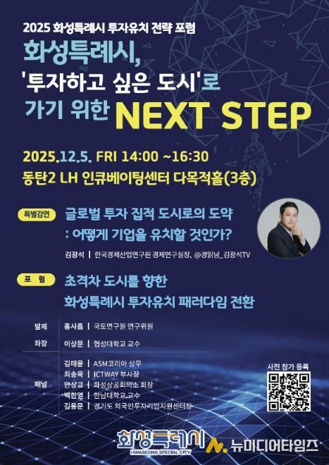 이번 포럼은 화성특례시에서 처음으로 개최되는 투자유치 전략 포럼으로 ‘화성특례시, 투자하고 싶은 도시로 가기 위한 넥스트 스텝(NEXT STEP)’을 부제로 개최된다.
