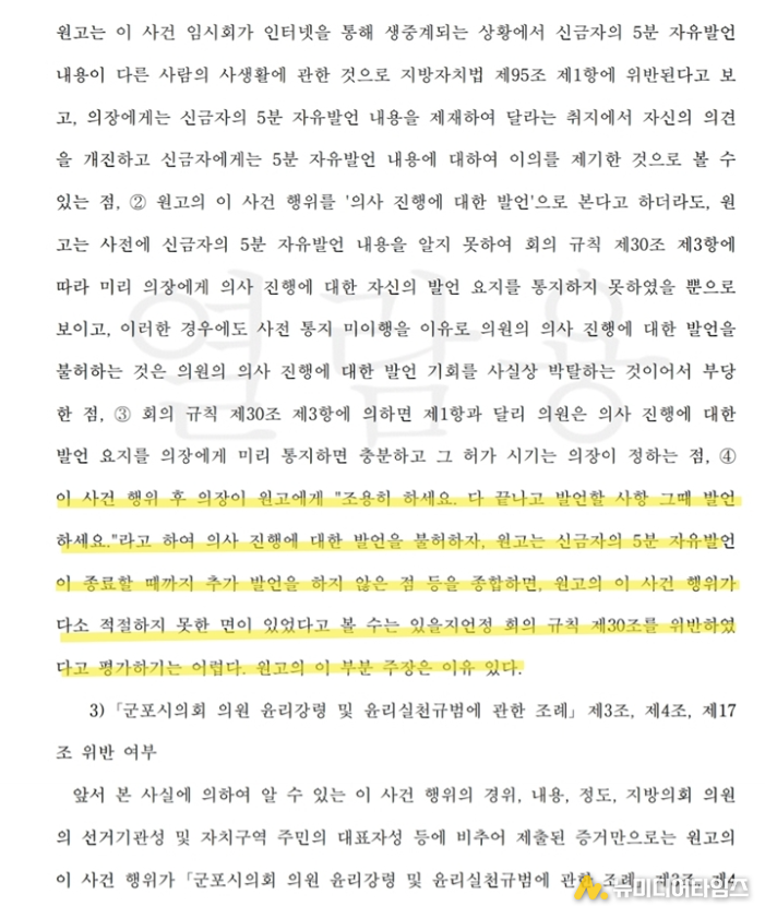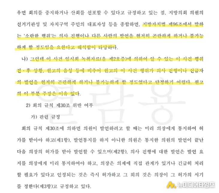 판결문 어디에도 "회의 방해"를 인정한 내용이 없습니다. 오히려 법원은 "박상현 의원의 행위가 회의 진행을 실질적으로 방해했다고 보기 어렵다"고 했고 "징계를 할 구체적 근거 자체가 없다"고 명확히 밝혔습니다.