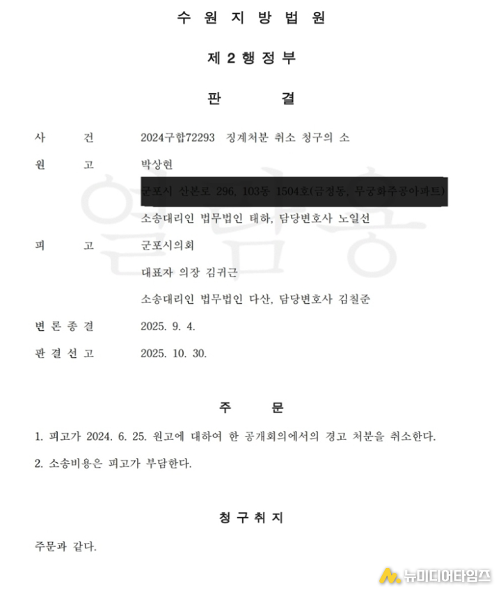 판결 이후에도 더불어민주당이 '의회 공식 입장'이라는 이름으로 판결 내용을 왜곡한 보도자료를 배포하면서 논란은 계속되고 있다. 박 의원을 만나 징계의 전말과 법원 판결의 의미, 그리고 군포시의회의 현실에 대해 들어봤다.