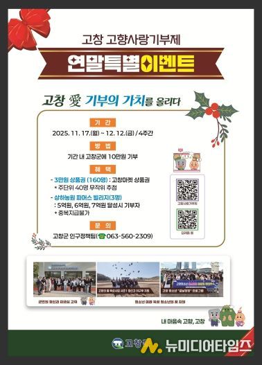 고창군이 연말정산 기간을 앞두고 ‘고향사랑기부제 특별이벤트-고창愛 기부의 가치를 올리다’를 12월12일까지 운영한다고 20일 밝혔다.