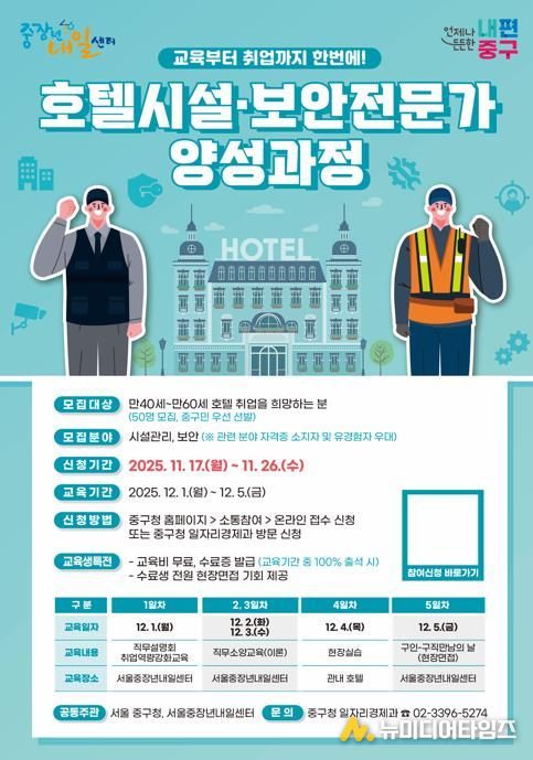 서울 중구가 지역 중장년층의 취업 기회를 확대하고 호텔 산업의 인력수급 안정화를 지원하기 위해 노사발전재단 서울중장년내일센터와 함께 '호텔 시설·보안 전문가 양성과정'을 운영한다.