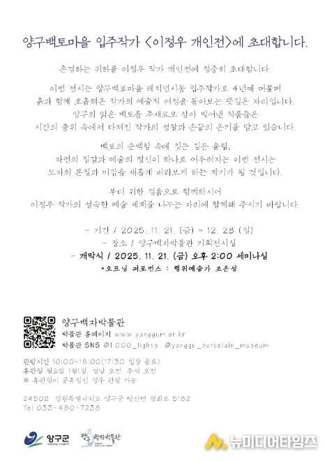 정두섭 양구백자박물관장은 “이번 전시는 흙이 만들어내는 자연의 질서와 작가의 감각이 조화롭게 어우러진 자리”라며, “이번 전시가 지역 도예문화의 창작 역량을 강화하고, 백토를 중심으로 한 양구만의 예술적 정체성을 널리 알리는 계기가 되기를 기대한다”고 말했다.