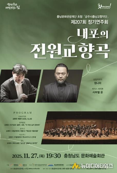 이번 연주회는 11월 27일 저녁 7시 30분, 충남도청 문예회관에서 열리며, 베이스바리톤 사무엘 윤의 깊고 단단한 울림과 드보르자크의 ‘교향곡 제8번’을 감상할 수 있다.