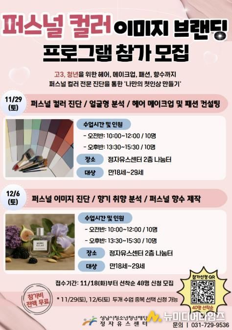 성남시청소년청년재단 정자유스센터는 고등학교 3학년 및 청년(만18세~29세)을 대상으로 자신에게 어울리는 색과 향을 찾아 첫인상을 설계하는 퍼스널 컬러 이미지 브랜딩 프로그램을 11월 29일과 12월 6일에 진행한다고 밝혔다.