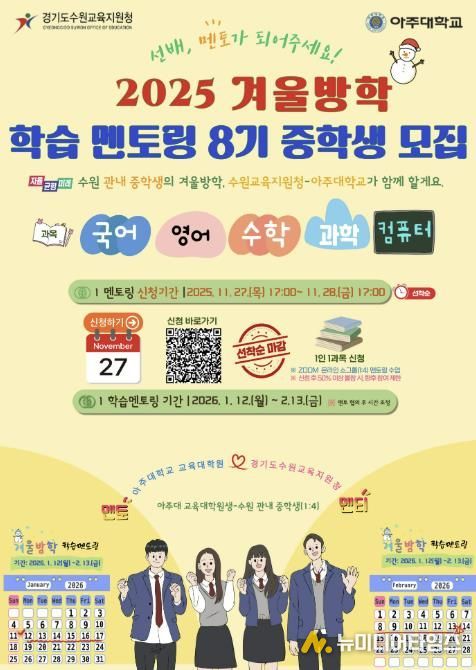 경기도수원교육지원청은 2026년 1월 12일부터 2월 13일까지 관내 중학생을 대상으로 '2025 겨울방학 학습 멘토링 8기'를 운영한다. 이번 프로그램은 ZOOM을 활용한 비대면 소그룹(1:4) 멘토링으로 진행되며, 아주대학교 교육대학원과 협력해 운영하는 교육 기부 기반 상생 프로그램이다.