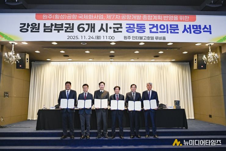 이날 서명식에는 원강수 원주시장, 김명기 횡성군수, 이상호 태백시장, 최명서 영월군수, 심재국 평창군수, 최승준 정선군수 등 강원 남부권 6개 시군의 시장·군수가 모두 참석해 원주(횡성)공항 국제화 추진에 뜻을 모았다.