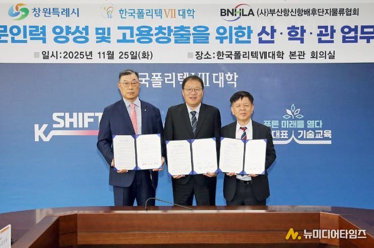 부산항신항과 진해신항 개항으로 항만·물류산업의 급속한 성장에 따라, 25일 한국폴리텍Ⅶ대학 창원캠퍼스에서 ㈔부산항신항배후단지물류협회와 한국폴리텍Ⅶ대학 창원캠퍼스, 창원특례시가 ‘항만·물류 전문 인력 양성을 위한 업무협약(MOU)’을 체결했다.