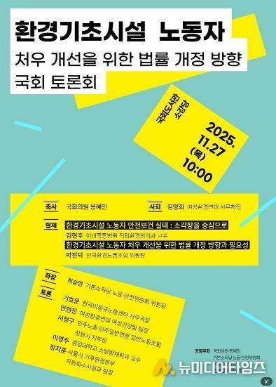기본소득당 국회의원 용혜인과 기본소득당 노동·안전위원회, 전국환경노동조합, 여성환경연대는 11월 27일 목요일 오전 10시, 국회도서관 소강당에서 '환경기초시설 노동자 처우 개선을 위한 법률 개정 방향 국회 토론회'를 공동 개최한다.
