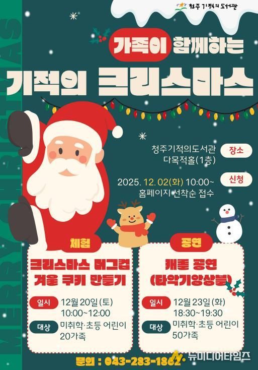 청주기적의도서관은 오는 12월 20일과 23일 청주기적의도서관 다목적홀(1층)에서 ‘가족이 함께하는 기적의 크리스마스’ 행사를 개최한다.