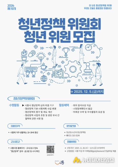 시흥시는 청년들의 다양한 목소리를 들을 수 있는 제10기 시흥시 청년정책위원회 청년위원을 오는 12월 5일까지 공개 모집한다.