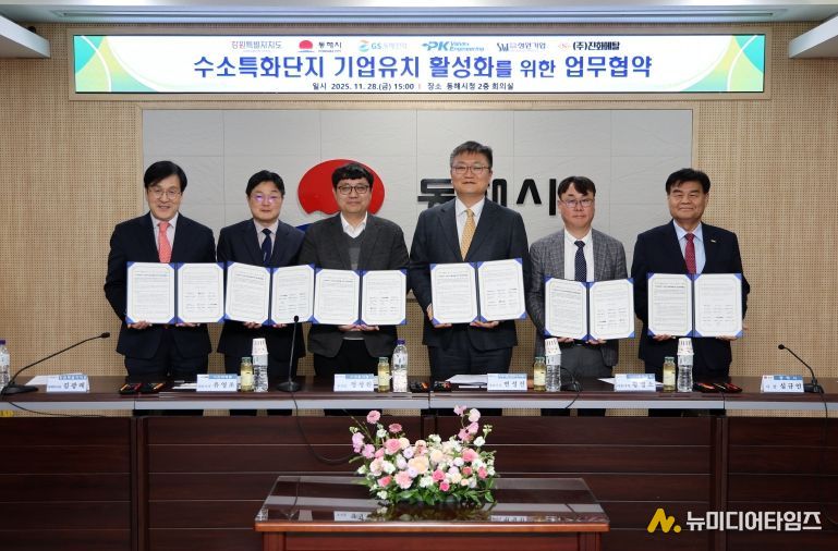 동해시는 11월 28일 동해시청 본관 2층 회의실에서 강원특별자치도, 피케이밸브앤엔지니어링㈜, ㈜성원기업, ㈜진화메탈, ㈜GS동해전력과 함께 수소특화단지 기업유치 활성화를 위한 업무협약(MOU)을 체결했다고 밝혔다.