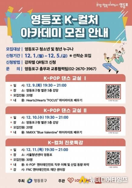 영등포구가 글로벌 K-컬처에 관심 있는 청소년과 청년을 대상으로 ‘댄스교실’과 ‘진로특강’으로 구성된 ‘영등포 K-컬처 아카데미’를 운영하고, 참가자를 모집한다고 밝혔다.