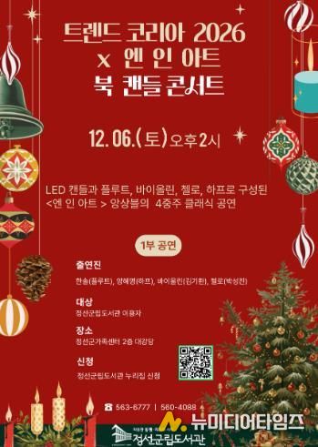 정선군립도서관은 오는 12월 6일 오후 2시, 정선군 가족센터 2층 대강당에서 ‘트렌드 코리아 2026 × 엔 인 아트 북 캔들 콘서트’를 개최한다고 2일 밝혔다.