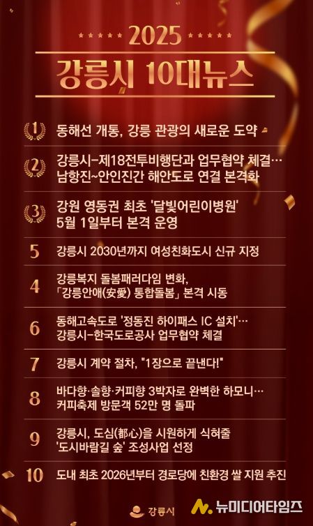 강릉시 관계자는 “올 한 해 강릉의 변화를 이끈 10대 뉴스는 공직자와 시민이 함께 만들어 낸 성과”라며, “이번 결과를 토대로 행정의 사각지대를 더욱 세심하게 살피고, 시민 누구나 일상에서 변화를 체감할 수 있도록 ‘더 큰 강릉, 더 따뜻한 강릉’을 향한 정책을 한층 속도감 있게 추진하겠다.”고 말했다.