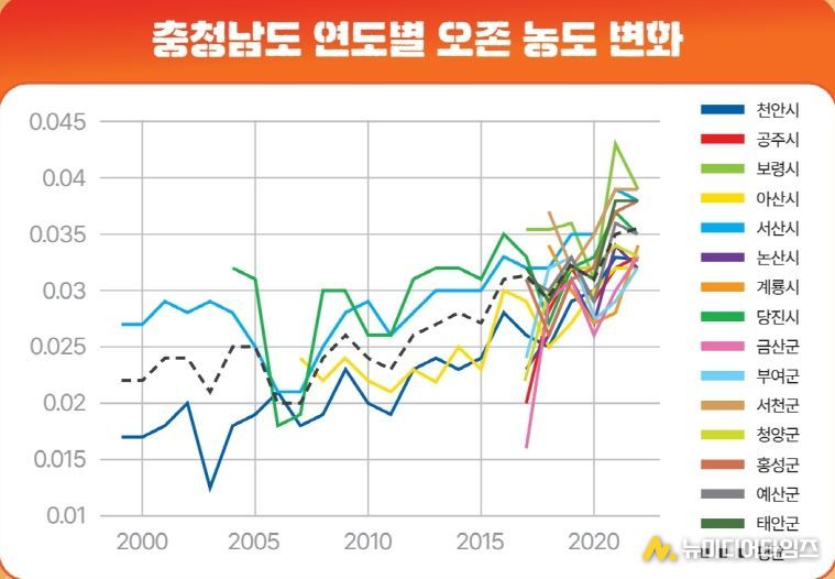 충청남도 내 오존(O₃) 농도가 최근 수년간 꾸준히 상승하면서 인체와 생태계에 피해를 줄 수 있는 ‘지표면 오존’ 관리 강화의 필요성이 커지고 있다.