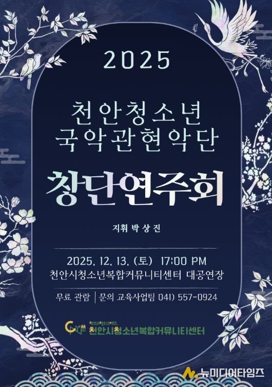 (재)천안시청소년재단 천안시청소년복합커뮤니티센터는 오는 13일 센터 대공연장에서 ‘천안청소년국악관현악단 1기 창단연주회’를 개최한다고 밝혔다.