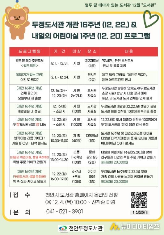 두정도서관 관계자는 “그동안 이용해주신 시민 여러분께 감사의 마음을 담아 개관 16주년과 어린이실 1주년을 기념하는 프로그램을 준비했다”며 “앞으로도 시민과 함께 성장하는 도서관이 되도록 노력할 것”이라고 말했다.