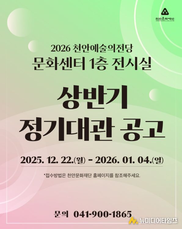 (재)천안문화재단은 오는 22일부터 천안예술의전당 문화센터 전시실 내년 상반기 정기대관 공모를 시작한다고 5일 밝혔다.