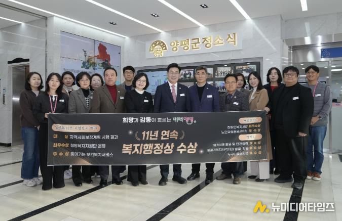이와 함께 양평군은 △희망복지지원단 운영 최우수 △찾아가는 보건복지서비스 제공 우수 △장애인복지사업 최우수 △노인맞춤돌봄서비스 우수상 등 다양한 분야에서도 우수한 성과를 거두며, 11년 연속 복지행정상 수상이라는 괄목할 만한 성과를 이뤄냈다. 또한 경기도 평가에서도 △위기이웃 발굴 및 민관협력 분야 우수상 △동절기 복지사각지대 발굴·지원 평가 우수 △누구나돌봄사업 우수상 등을 수상하며 지역복지 전반에서 두드러진 성과를 거뒀다.