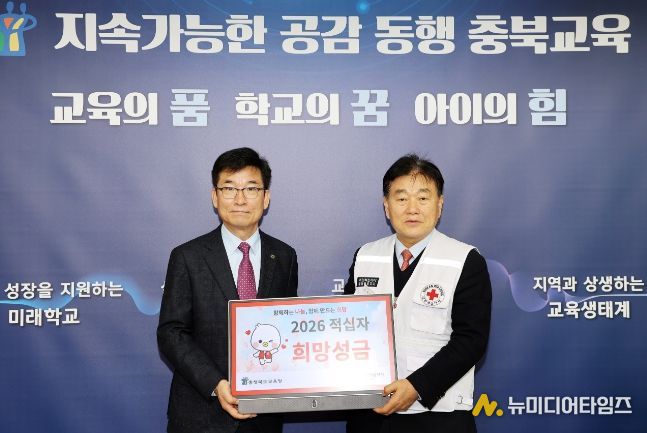 충청북도교육청은 17일, 교육감실에서 대한적십자사 충북지사(회장 장현봉)에 2026년 적십자 특별회비를 전달했다.