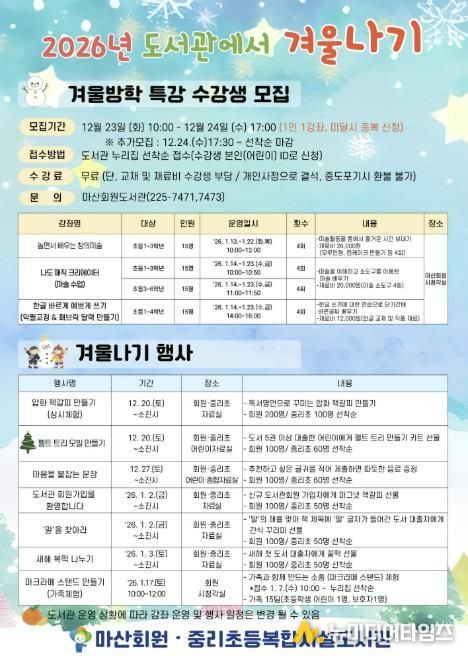 창원특례시는 다가오는 겨울을 맞이해 온 가족이 함께 즐길 수 있는 2026년 도서관에서 겨울나기 행사를 12월 20일부터 내년 1월 30일까지 마산회원도서관과 중리초등복합시설도서관에서 운영한다.