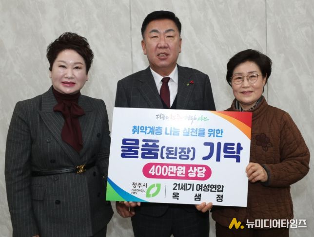 임시청사 직지실에서 진행된 기탁식에는 이범석 청주시장과 유현순 21세기여성연합 청주시지부 회장, 전순자 옥샘정 대표가 참석했다.