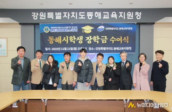 동해교육지원청은 국제라이온스협회 354-E(강원)지구 제12지역 센트랄라이온스클럽과 함께 12월 22일 동해교육지원청에서 ‘2025년 동해 학생 장학금 수여식’을 개최하고, 선발된 학생 3명에게 각각 20만 원의 장학금을 전달했다.