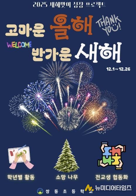 쌍동초등학교는 연말연시를 맞아 전교생이 참여하는 ‘고마운 올해, 반가운 새해’ 새해맞이 성장 프로젝트를 진행했다. 학생들은 한 해를 돌아보고 감사의 마음을 표현하며, 새해 목표를 시각적으로 드러내는 다양한 활동을 경험했다.