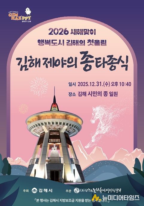 김해시는 ‘2025 김해 제야의 종 타종식’을 오는 31일 오후 10시40분부터 2026년 1월 1일 0시 30분까지 김해시민의 종 일원에서 개최한다고 26일 밝혔다.