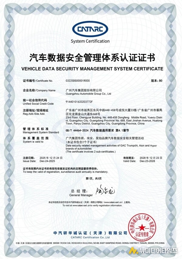 톈진 및 광저우, 중국 2026년 1월 1일 -- GAC가 12월 24일 업계 최초로 차량 데이터 보안 관리 시스템 인증(Vehicle Data Security Management System Certification, 인증서 번호: 03225DS00001)을 획득하며 차량 데이터 보안 분야에서 공식적으로 다시 한번 인정받았다. 이번 성과는 GAC가 업계에서 체계적인 데이터 보안 구축을 선도하고 있음을 보여주는 것으로, 지능형 커넥티드 시대의 자동차 데이터 거버넌스에 대한 새로운 기준을 제시한다.