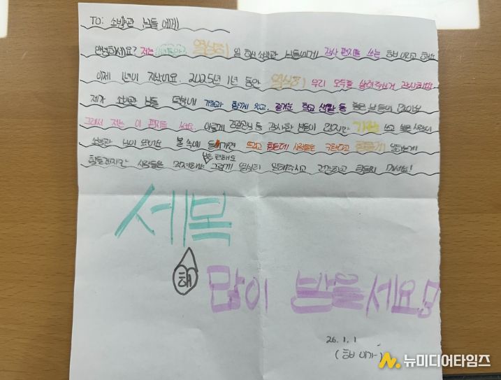 어린이가 직접 쓴 편지에는 “2025년 한 해 동안 시민의 생명과 안전을 지키기 위해 최선을 다해 주셔서 감사하다”는 내용이 담겨 있었으며, 현장에서 땀 흘리는 소방관들을 향한 따뜻한 응원의 마음이 고스란히 전해졌다.