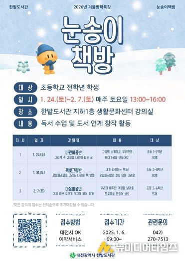 대전 한밭도서관은 겨울방학을 맞아 어린이들의 독서 흥미 고취를 위해 겨울방학특강‘눈송이 책방’을 운영한다.