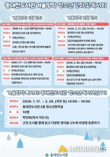 동대전도서관은 겨울방학을 맞아 오는 1월 4일부터 2월 28일까지 청소년을 대상으로 독서회 및 창작 체험 강좌를 운영한다.