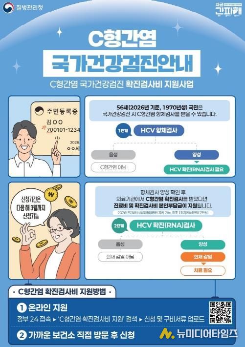 지원 대상은 56세 국가건강검진에서 C형간염 항체 양성판정을 받고 확진 검사(HCV RNA)를 받은 시민(2026년 기준 1970년생)으로, 확진 검사 시 수반되는 진찰료와 검사비 본인부담금을 최초 1회에 한해 최대 7만 원까지 지원한다.