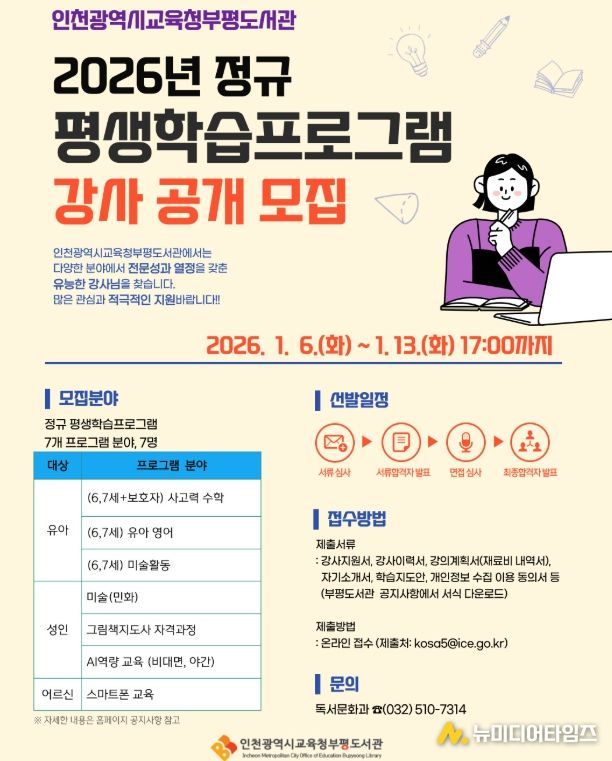 인천광역시교육청부평도서관은 시민의 평생학습 기회를 확대하고 행복한 삶을 지원하기 위해'2026년도 정규 평생학습 프로그램' 강사를 모집한다.