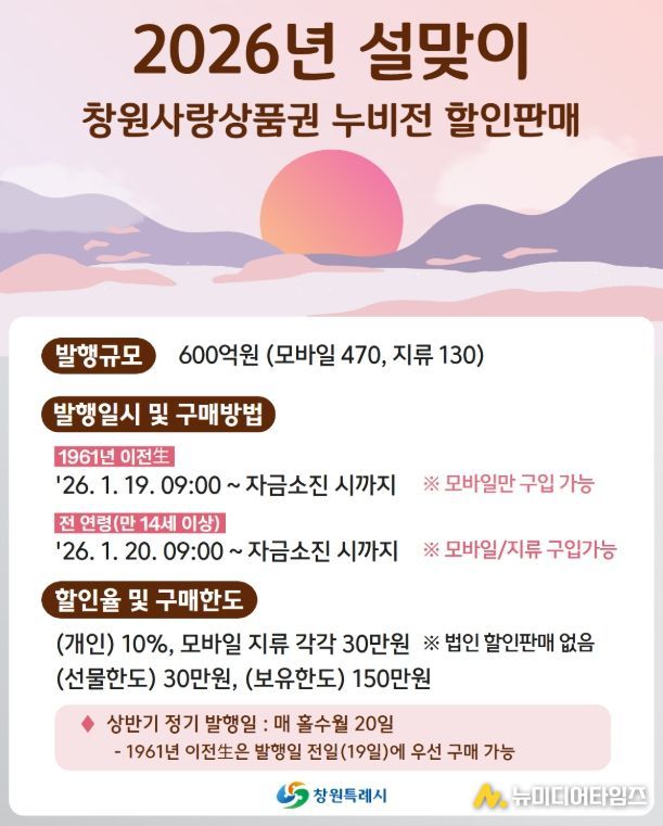 심동섭 경제일자리국장은 “설 명절을 앞두고 시민들의 소비 부담을 덜고 지역 상권에 활력을 더할 수 있도록 발행규모와 할인 혜택을 함께 고려했다”며 “앞으로도 시민이 체감할 수 있는 방향으로 창원사랑상품권을 지속적으로 확대·운영하겠다”고 밝혔다.