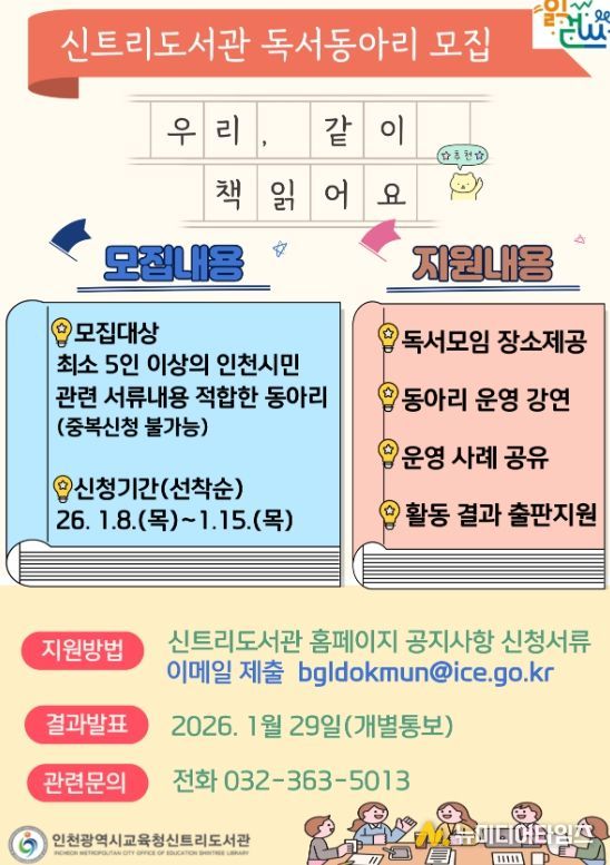 인천광역시교육청신트리도서관은 시민 주도의 자율적인 독서 활동을 지원하고 생활 속 독서문화를 확산하기 위해 '2026년 자율독서동아리 지원사업'의 동아리를 모집한다.