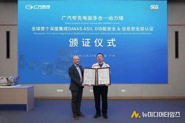 광저우, 중국 2026년 1월 11일 -- 최근 광저우자동차그룹(GAC)이 독자 개발한 쿼크 전기 구동(Quark E-Drive) 파워트레인 도메인 컨트롤러 시스템이 독일 국가 인증 기구인 DAkkS로부터 세계 최초로 ASIL D 기능 안전 및 정보 보안 심층 통합 부문의 이중 인증을 획득했다. 이번 인증은 세계적인 공인 인증 기관인 SGS-CSTC 표준 기술 서비스(SGS-CSTC Standards Technical Services Co., Ltd.•SGS)의 평가를 거쳐 발행됐다.
