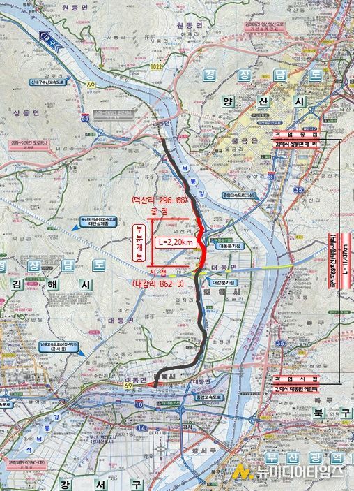 김해시는 12일 오전 10시 국지도 69호선 일부구간(대동 감내교차로~신암교차로) 2.2km가 개통됐다고 밝혔다.